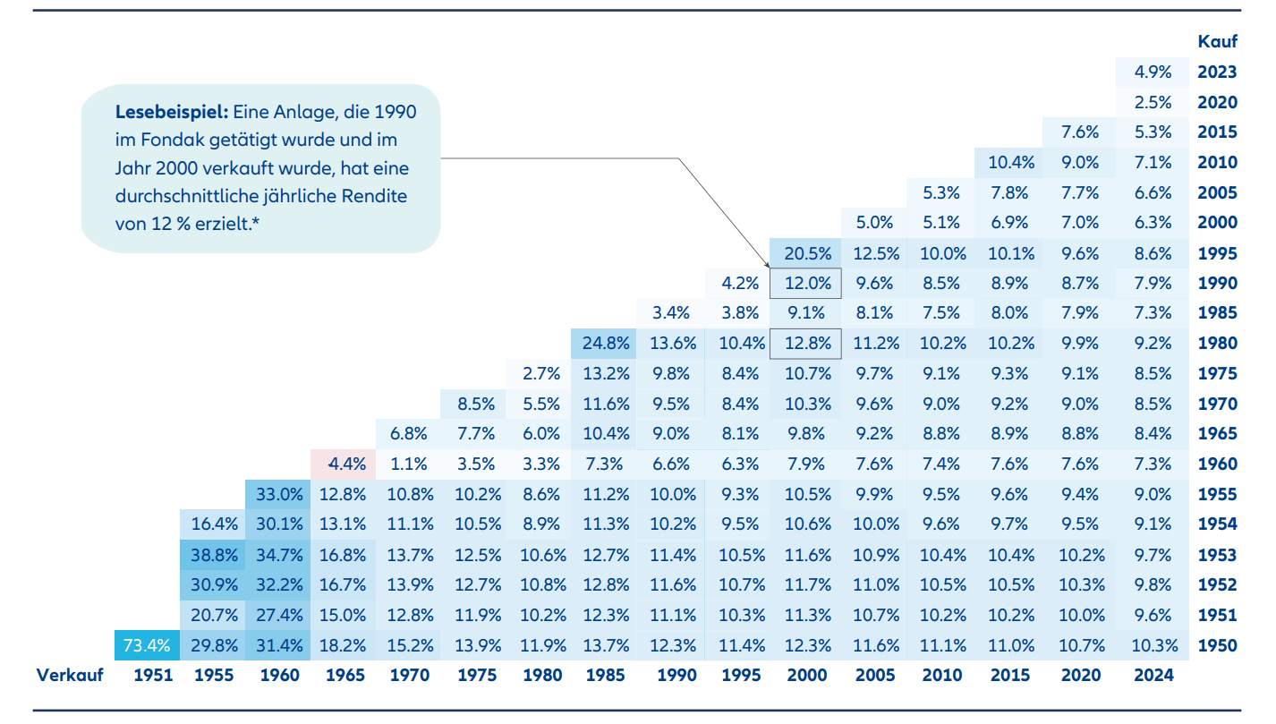 Der Fondak bietet seit nunmehr 75 Jahren eine breit diversifizierte Möglichkeit, am Erfolg zukunftsfähiger deutscher Unternehmen teilzuhaben. Auch wenn sich die Märkte wandeln, bleibt der Fonds seinem Prinzip treu. Mit klarem Blick, Ausdauer und der Inspiration, neue Entwicklungen frühzeitig zu erkennen, nutzt er Chancen – ganz im Sinne eines Investors mit dem Geist eines Pioniers. Die langfristige Wertentwicklung4 des Fondak zeigt, dass je länger der Anlagehorizont ist, desto höher ist die Wahrscheinlichkeit einer attraktiven Rendite. In einem Umfeld moderater Zinsen, in dem auch Tages- und Festgeld wieder gefragt sind, bleibt die langfristige Perspektive entscheidend. Denn während liquide und risikoarme Anlageformen kurzfristig Sicherheit bieten, ermöglichen breit gestreute5 Aktienfonds langfristig eine Beteiligung am Produktivkapital der deutschen Wirtschaft, mit deutlich höherem Renditepotenzial. Gerade mit Blick auf Altersvorsorge und die Herausforderungen des demografischen Wandels sind sie aus unserer Sicht unverzichtbar. Der Fondak bietet hier auch in Zukunft einen attraktiven Zugang zum deutschen Aktienmarkt.