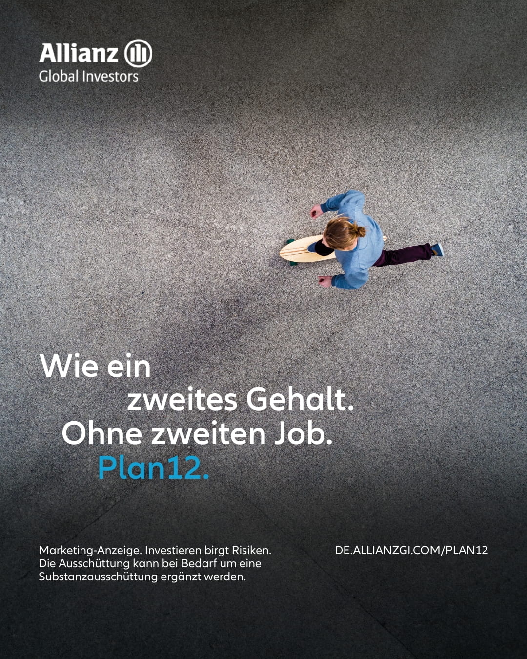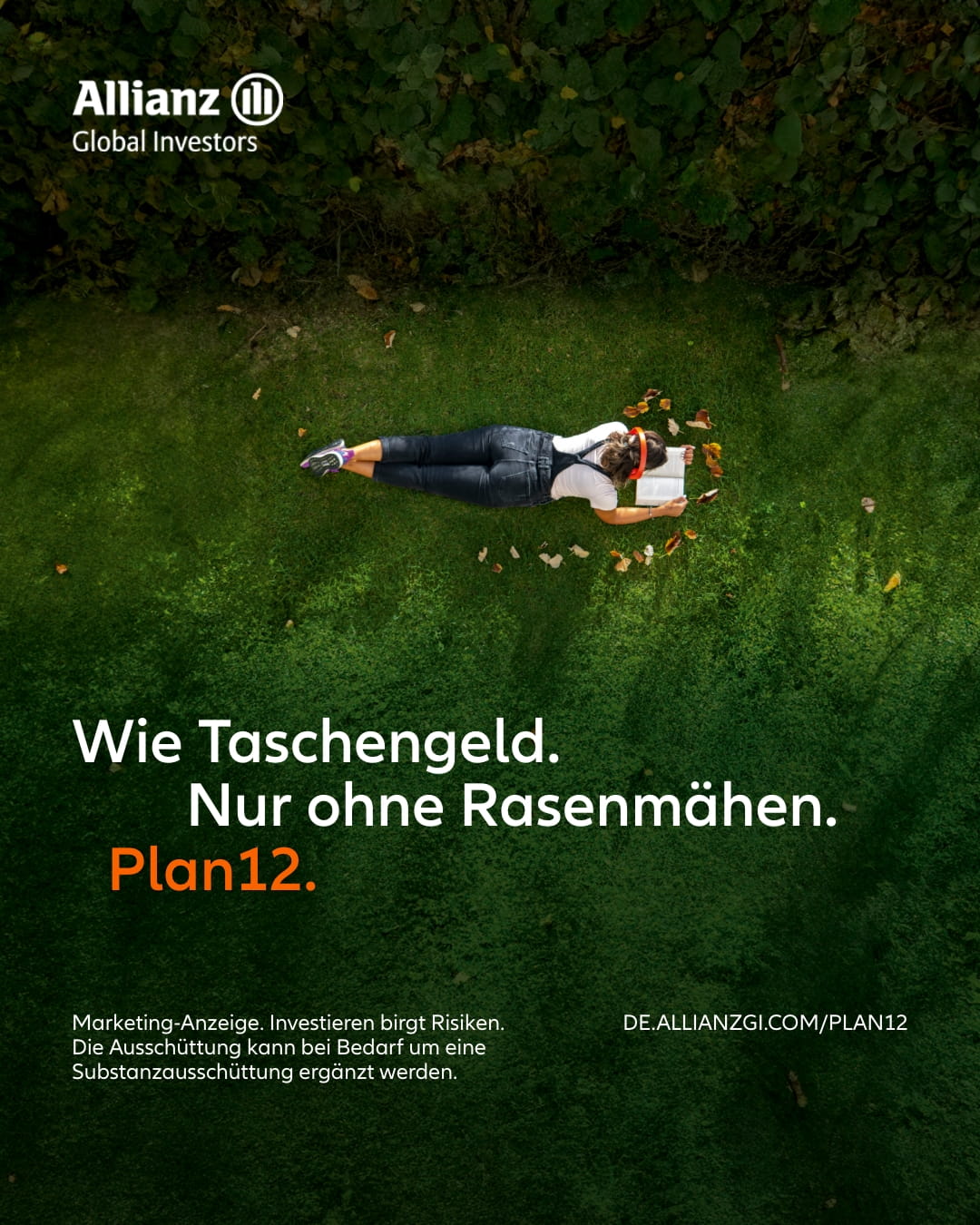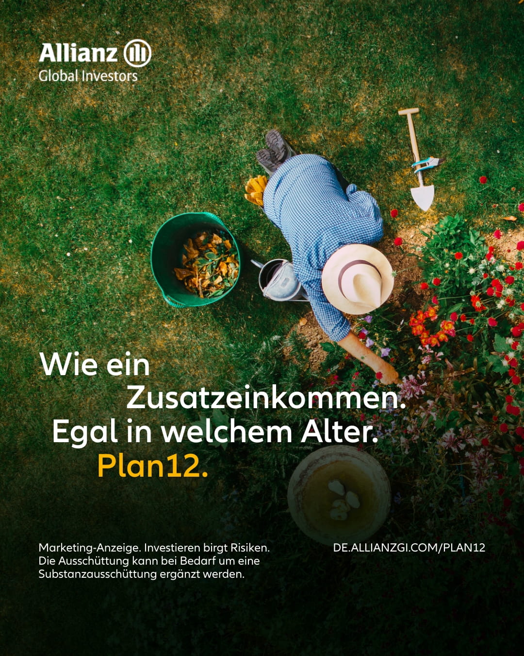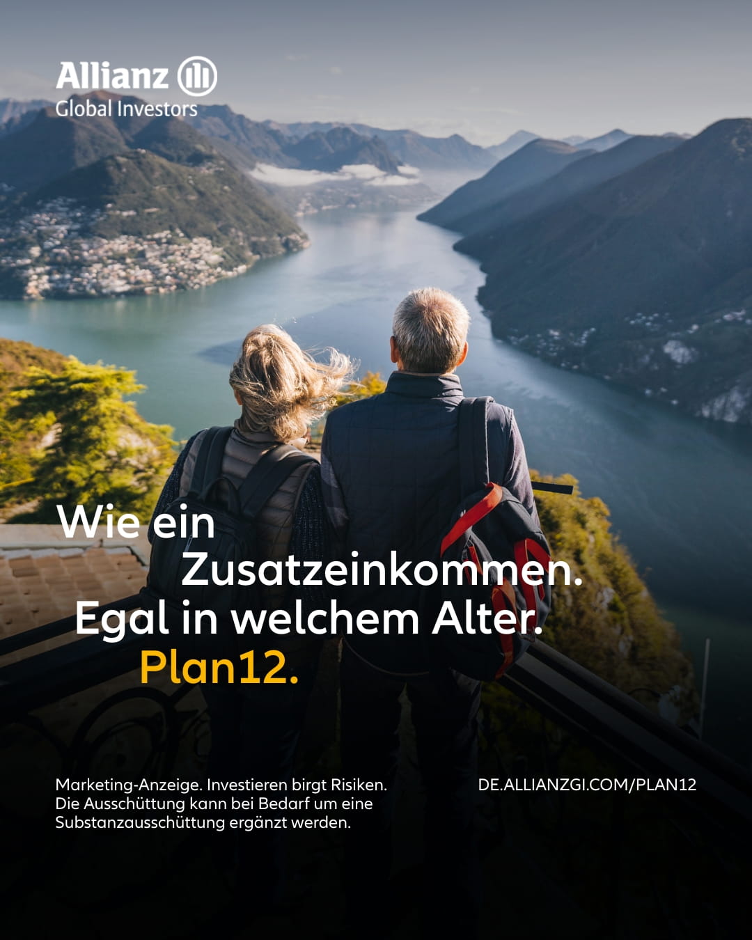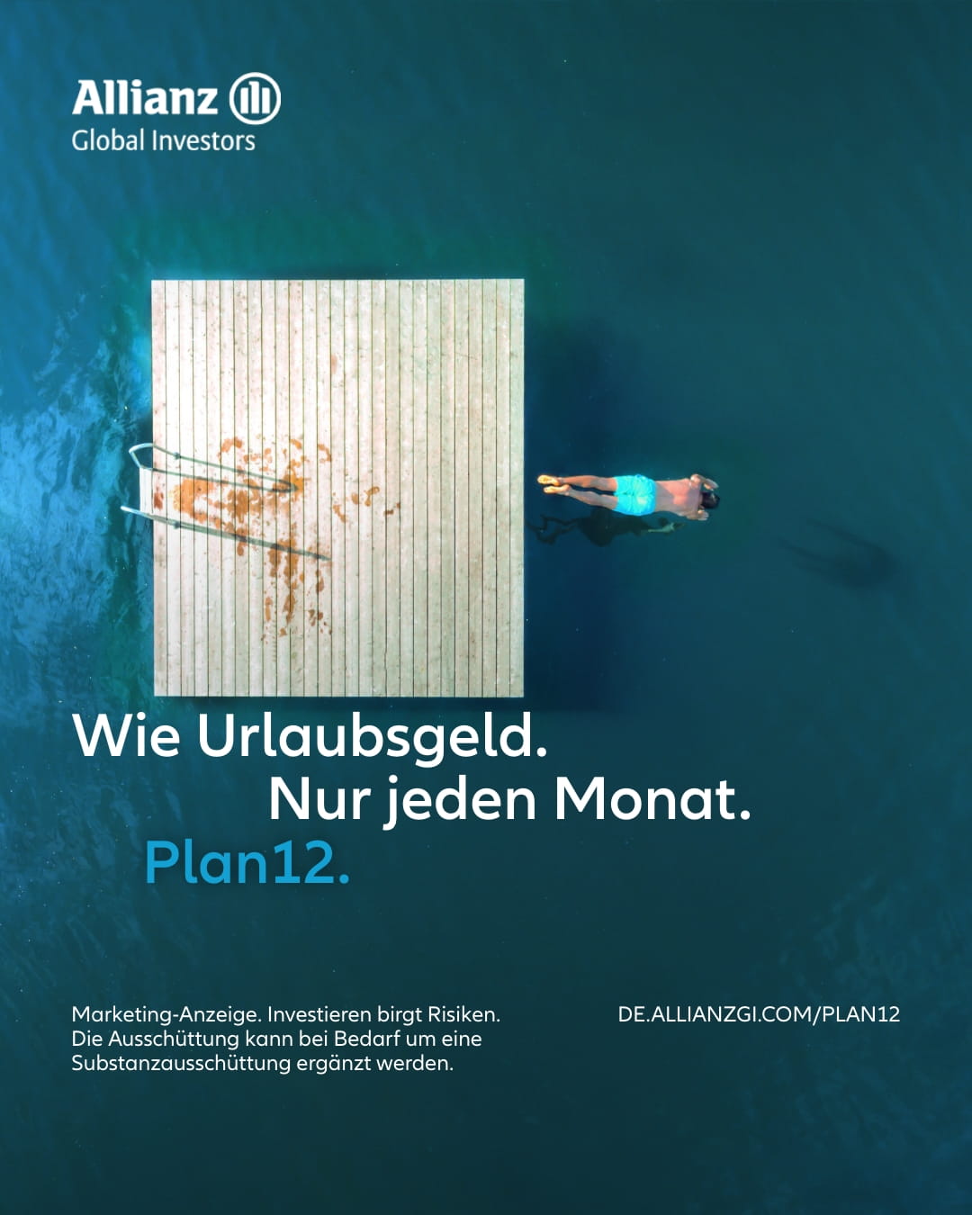 Plan12 steht für aktiv gemanagte Fonds von Allianz Global Investors, die auf Wachstum ausgerichtet sind und monatliche Ausschüttungen aus Zinsen und Dividenden anstreben. Wir nennen das Kapitaleinkommen. Und davon kann man monatlich profitieren. Ob als Beitrag zur Schließung der Rentenlücke, zur Ausbildungsunterstützung der Enkel, für den Kurzurlaub zwischendurch oder einfach für all die Dinge, die man sich gerne gönnt.